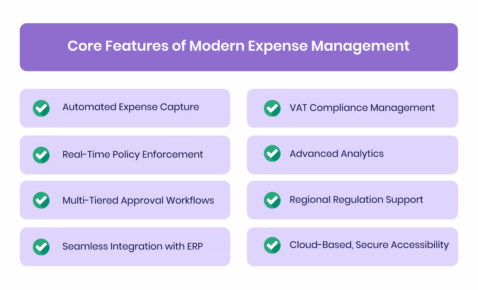 • Modern expense management tools use real‑time tracking, policy enforcement, and ERP integration to reduce manual errors, fraud, and approval delays.