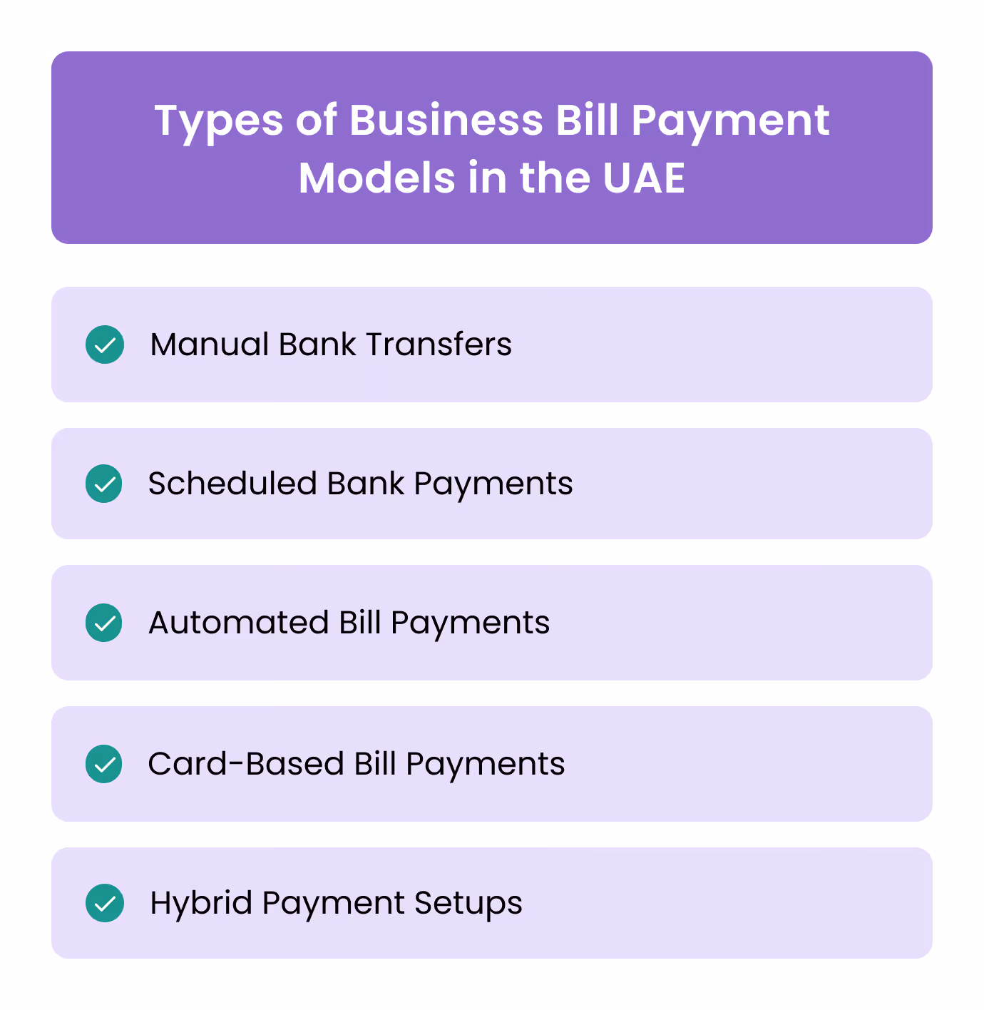 - Business Bill Payments Don't Rely On a Single Method: UAE finance teams use a mix of manual transfers, scheduled payments, automation, and cards, each chosen based on risk, approval needs, and cash timing.