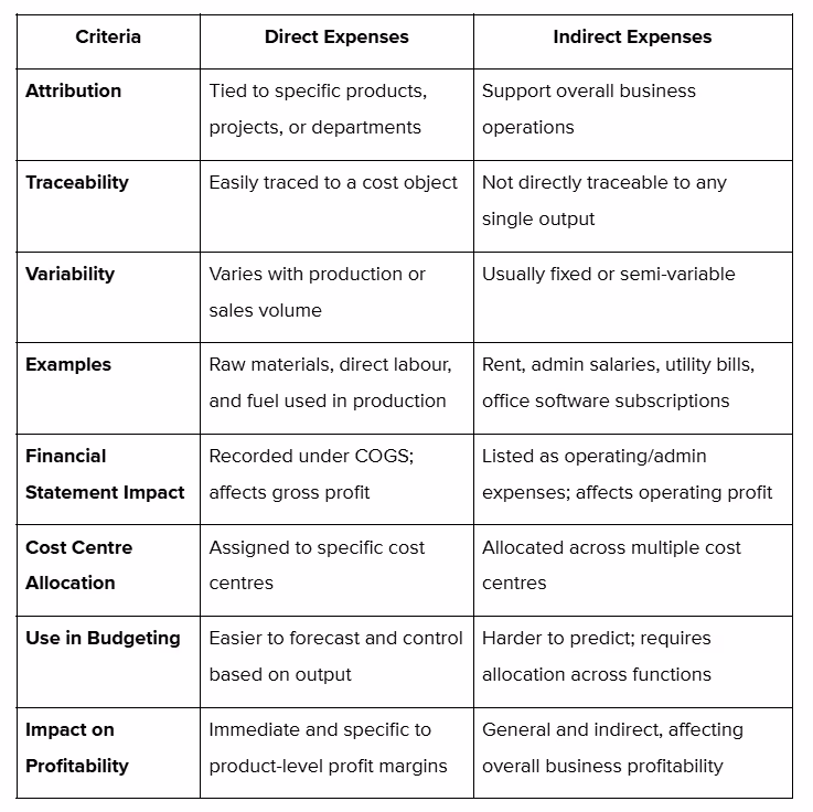 Direct expenses are charged to specific cost centres, such as production or project teams, making them easily traceable and allowing precise profit tracking per product or project. This clear allocation also helps assign accountability and monitor departmental performance.