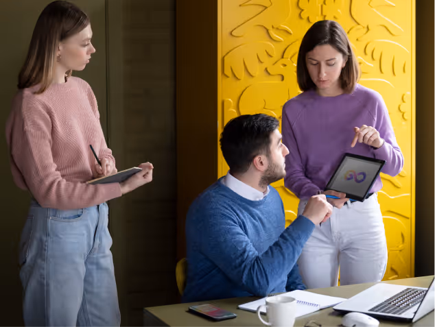 A diverse group of five people having a discussion in a bright room around a table with a tablet and notebooks.
